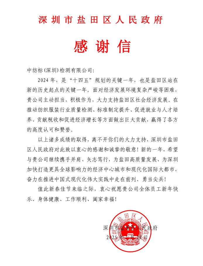 新年伊始,通用技术必威betway登录入口(深圳)检测有限公司(以下简称“深圳必威betway登录入口”)收到了深圳市盐田区人民政府的感谢信,对2024年深圳必威betway登录入口在面对经济发展环境复杂严峻等困难,主动担当,积极作为,助力盐田区社会经济发展,在推动纺织服装行业质量检测、标准制定提升、促进就业与人才培养、贡献税收和促进经济增长等方面给予了充分肯定和高度评价。